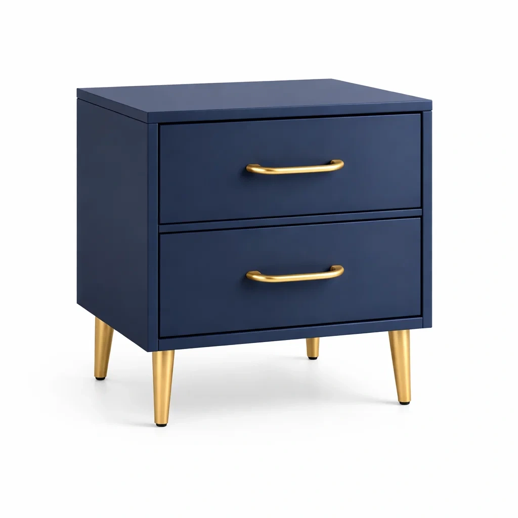 Table de chevet en bois bleu avec deux tiroirs et pieds en métal doré