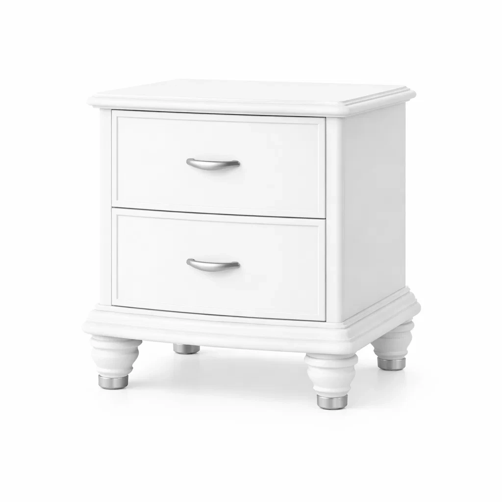 Table de chevet en bois blanc avec 2 tiroirs et poignées métalliques