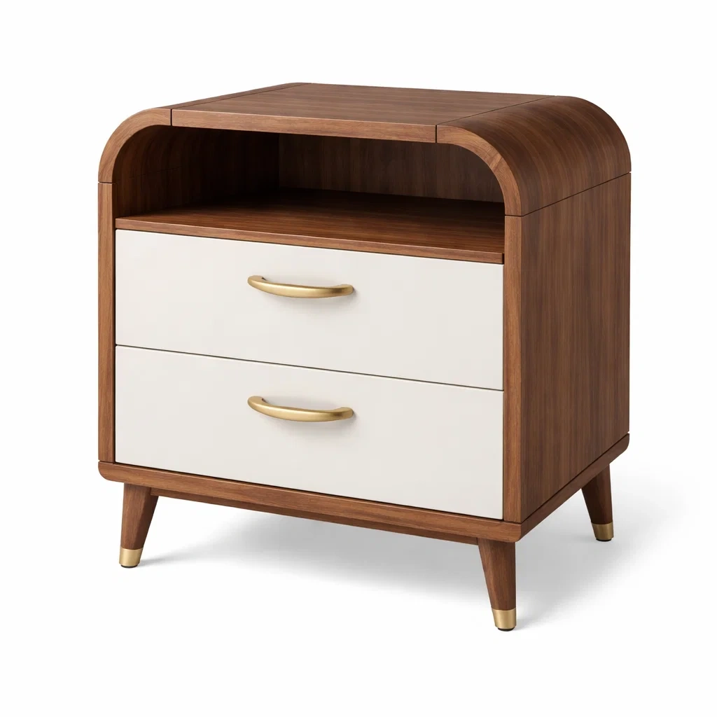 Table de chevet en bois avec deux tiroirs couleur noyer et blanc
