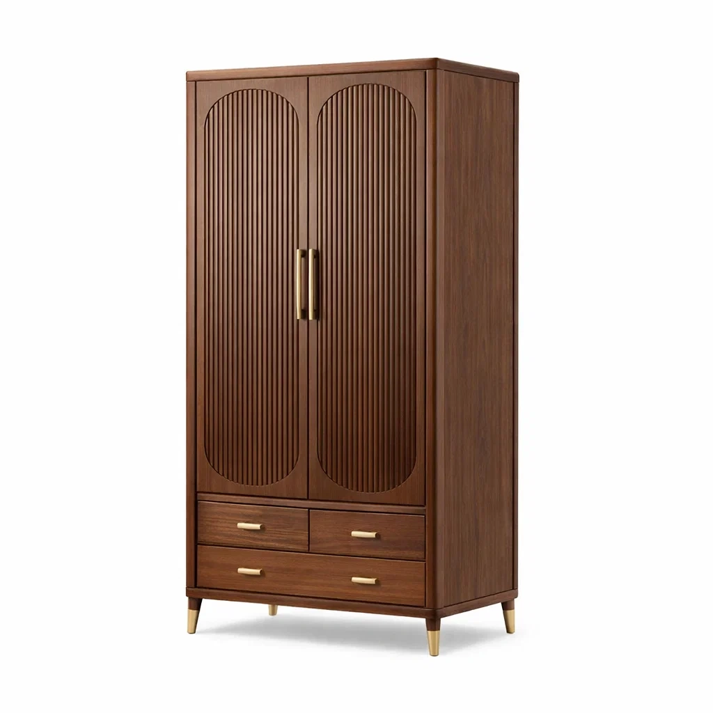 Armoire en bois de chêne avec portes à motifs et trois tiroirs. Les poignées sont en laiton brossé.