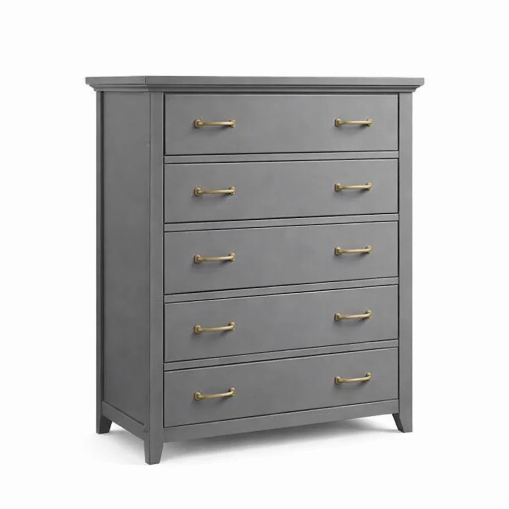 Commode en bois gris avec 5 tiroirs et poignées en métal doré
