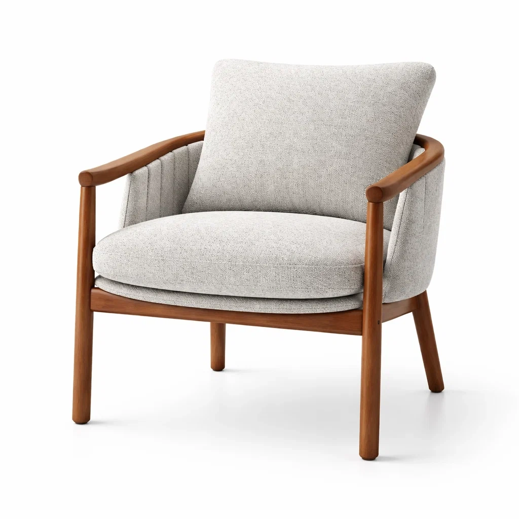 Ce fauteuil dispose d'une structure en bois massif et d'un revêtement en tissu lin gris clair.