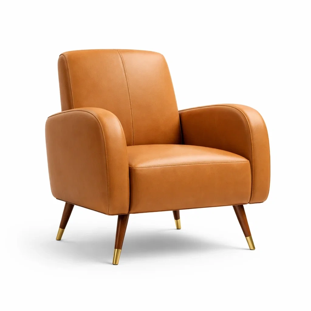 Ce fauteuil est revêtu de cuir synthétique avec une structure en bois. Ses pieds sont en bois avec une finition en laiton.