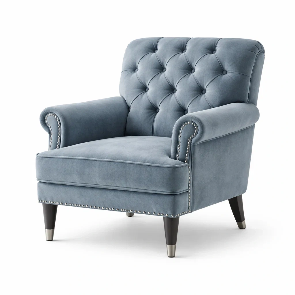 Fauteuil en velours bleu avec pieds en bois