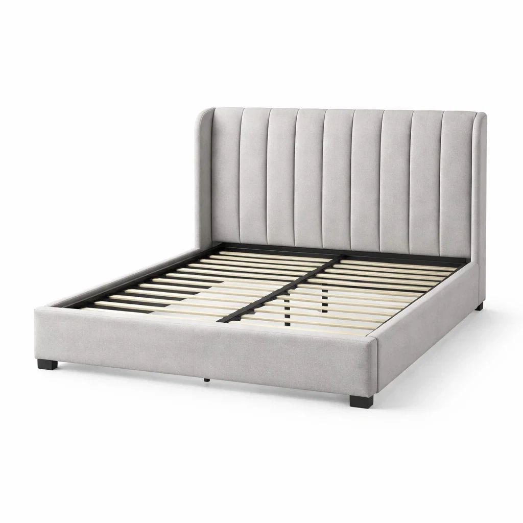 Lit plateforme avec revêtement en tissu velours polyester. La structure est en bois massif et les lattes en contreplaqué.