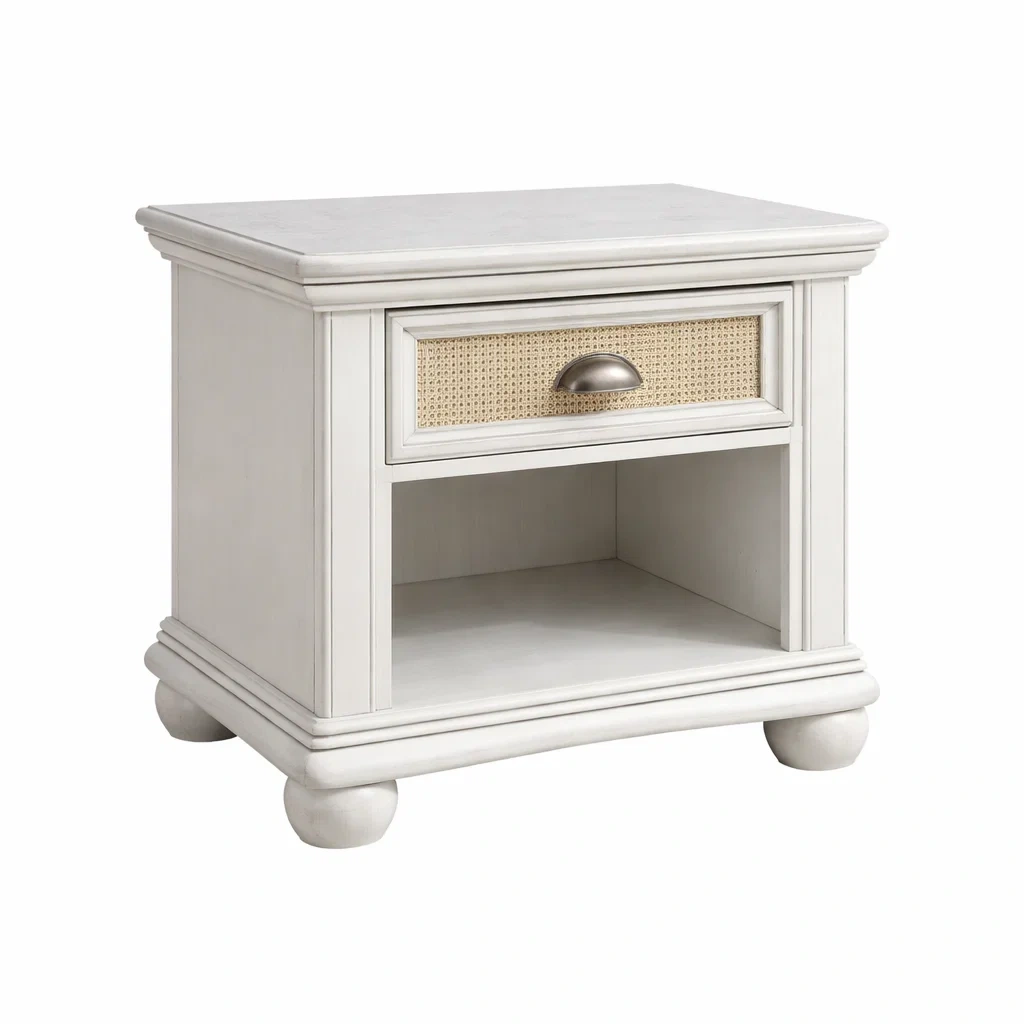 Table de nuit en bois massif avec un tiroir en rotin. Dimensions : 60 cm de longueur, 40 cm de largeur, 55 cm de hauteur. Couleur : Blanc avec des détails naturels. Dispose d'un tiroir et d'un espace ouvert pour le rangement. Usage intérieur uniquement. Nettoyage avec un chiffon humide.