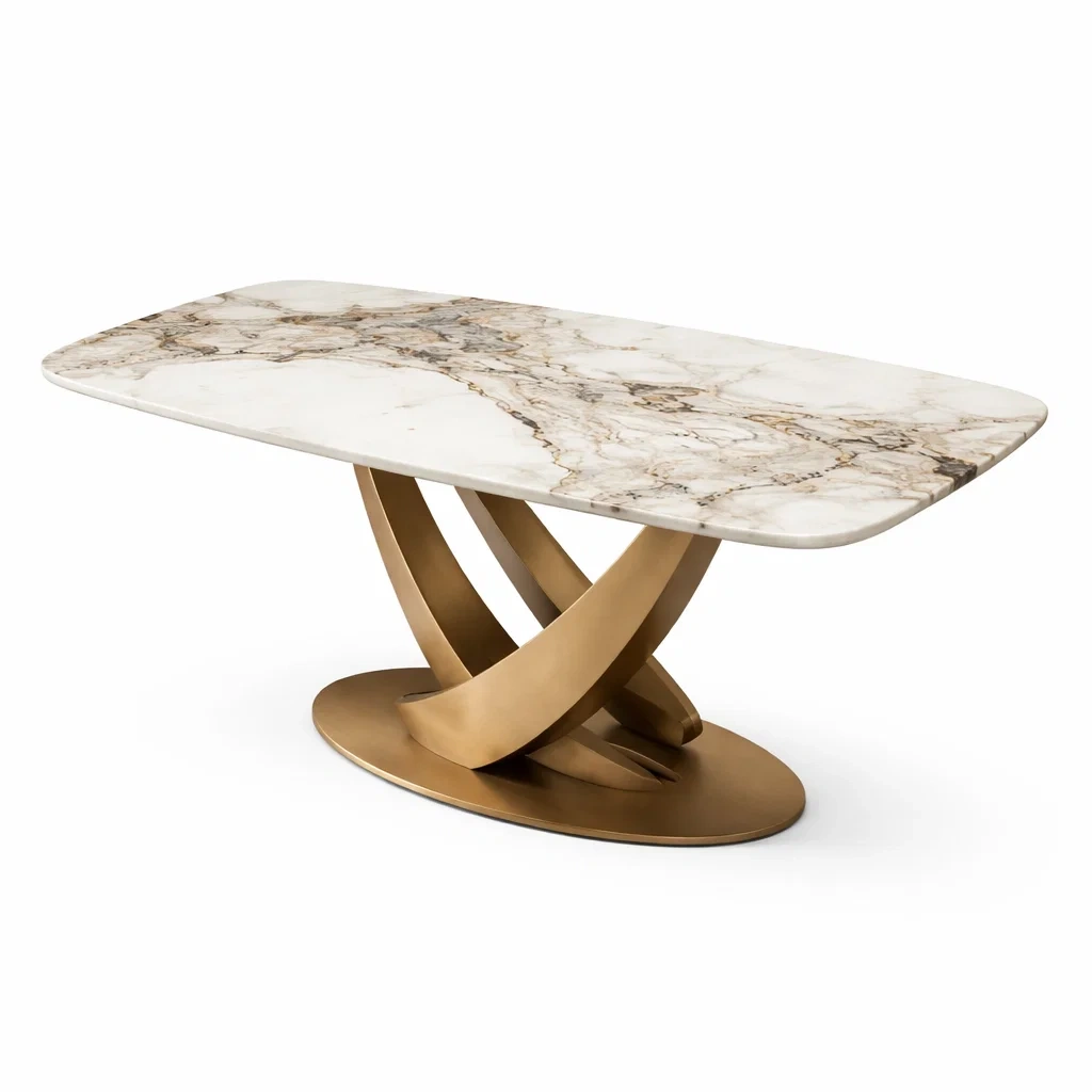 La table est constituée d'un plateau en marbre naturel avec une structure en métal doré.