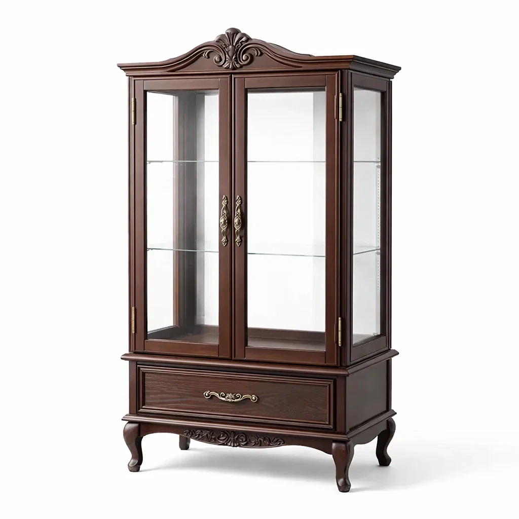 La vitrine est fabriquée en bois massif avec des panneaux en verre trempé de 5 mm. Elle dispose de deux portes vitrées et d'un tiroir inférieur pour un rangement supplémentaire.
